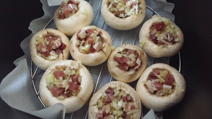 Paso 4: Ponemos papel de horno en la cubeta y encima la rejilla de hornear y vamos colocando los champiñones sobre la rejilla. Añadimos un poco de sal por encima de todos y cerramos la tapa.