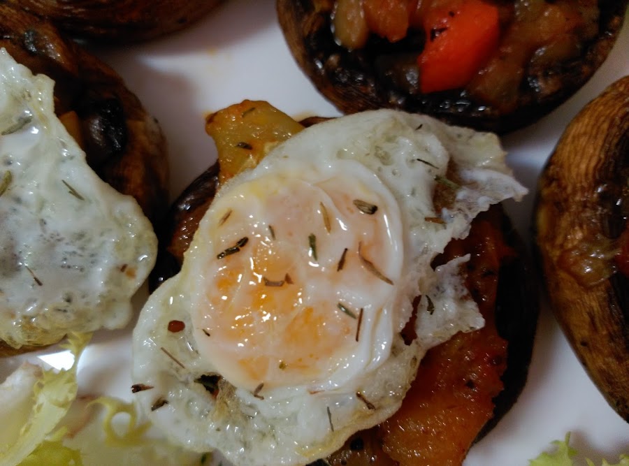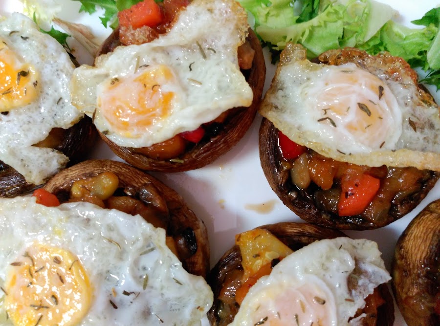 En una sartén fríe los huevos de codorniz y ponlos encima de cada champiñon.