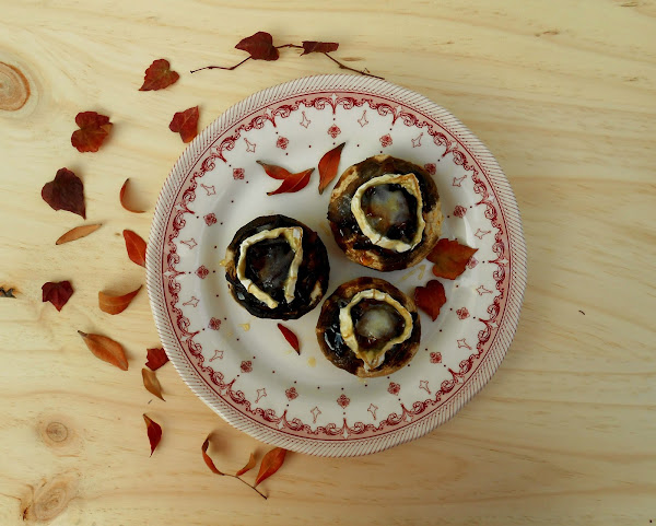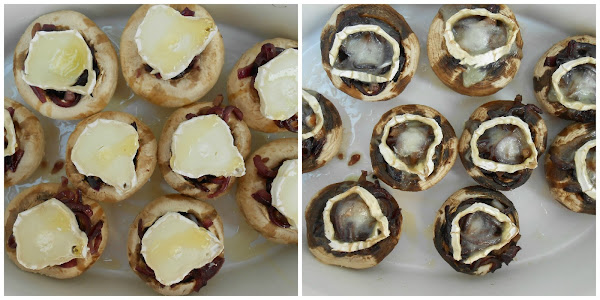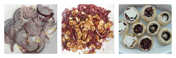 En una bandeja para horno ponemos un poco de aceite y colocamos allí los champiñones. Rellenamos con un poco de cebolla caramelizada, ponemos una rodaja de queso de cabra en cada uno y rociamos con miel.
