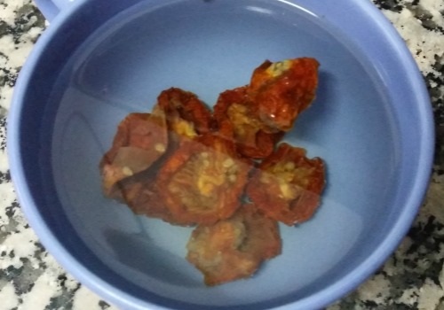 1- Hidratamos los tomates secos en agua caliente durante un cuarto de hora, como mínimo.
