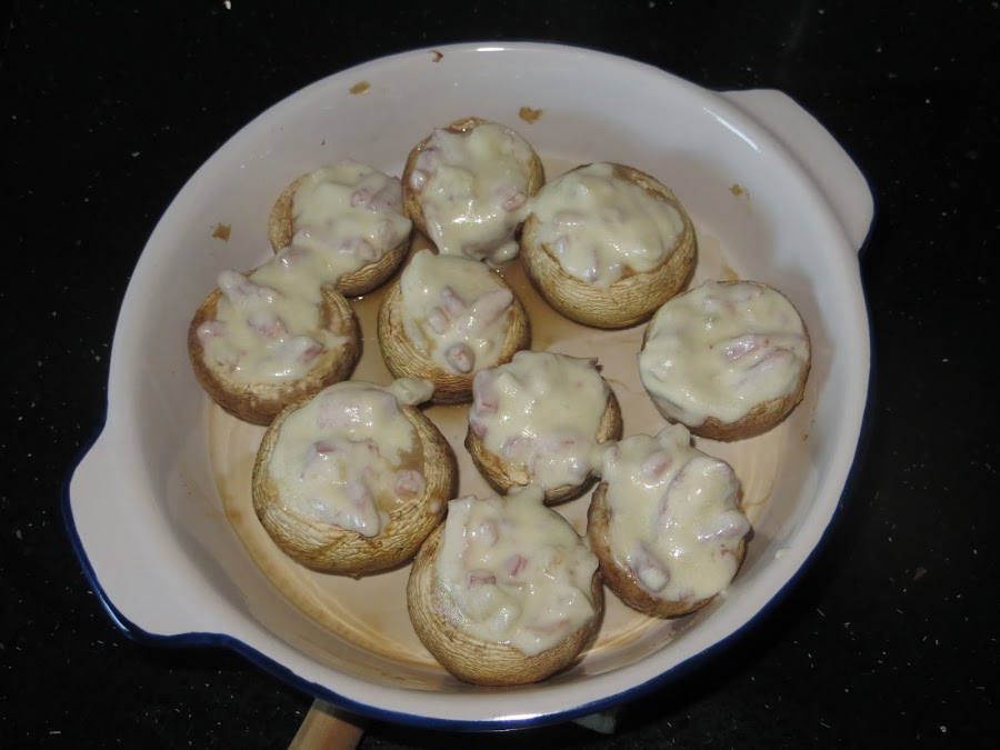 Sacamos los champiñones del horno, rellenamos con la salsa y los volvemos a meter durante cinco minutos más, podemos echarles queso rallado por encima. Lo sacamos y ya están listos para comer, puede ser un delicioso aperitivo o un magnífico primer plato.