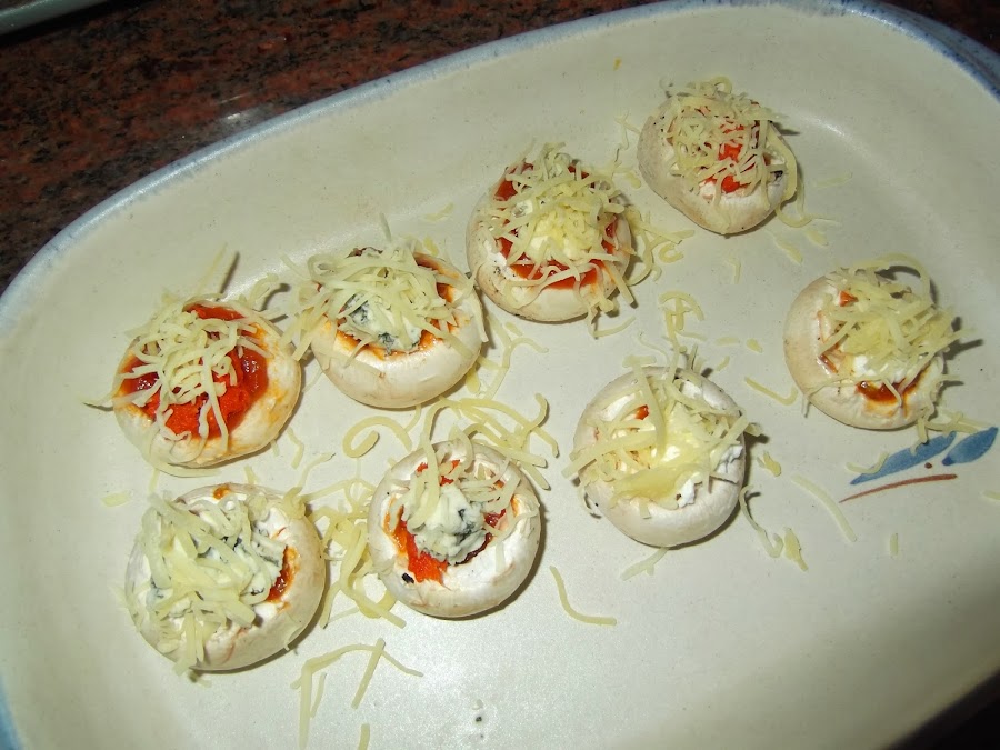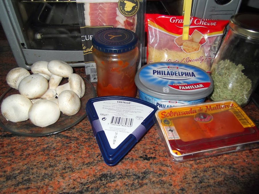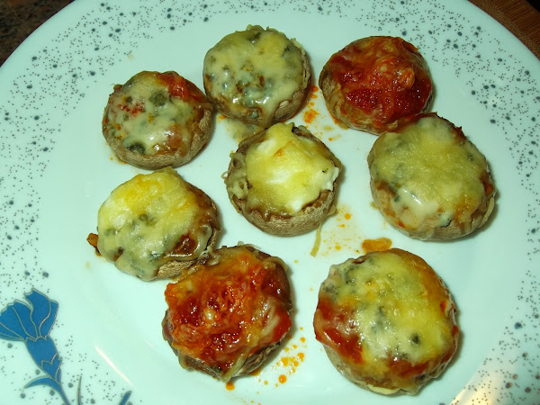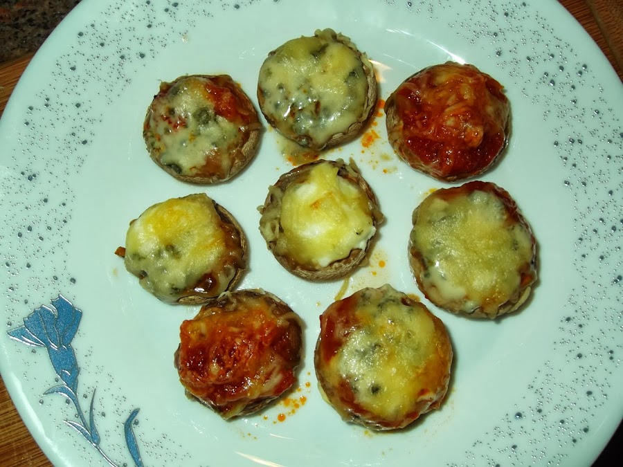 Debéis limpiar muy bien los champiñones, les quitamos el pie y en el hueco colocamos un poco de tomate frito con orégano y unas gotas de aceite. Encima le colocáis los ingredientes que más os gusten, el queso azul le da un toque buenísimo, así como la sobrasada o cualquier embutido. Si los queréis hacer más sanos ponerle algo de verdura, atún o anchoas.