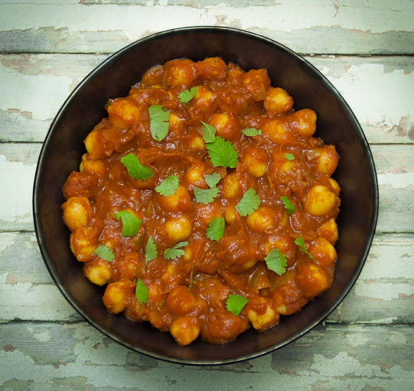 Después, incorporad a la sartén los garbanzos y el agua, dejando que reduzca hasta que consigáis la consistencia adecuada, que para mi gusto debe ser de una salsa bien espesa. Probadlo para ver si necesita un poco mas de sal o un golpe mas de especias y una vez listo sevidlo en unos cuencos con un poco de cilantro fresco picado por encima.