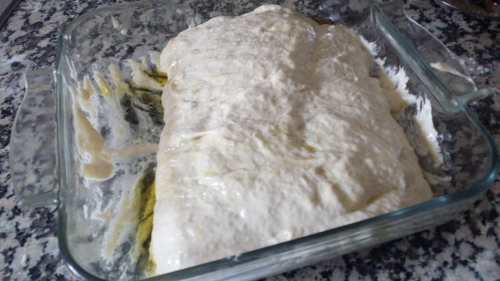 y pasamos la masa. Tapamos y dejamos reposar durante 2 horas, haciendo plegados cada 30 minutos. Los plegados consisten endoblar uno de los lados hacia el centro y el lado opuesto también hacia el centro.