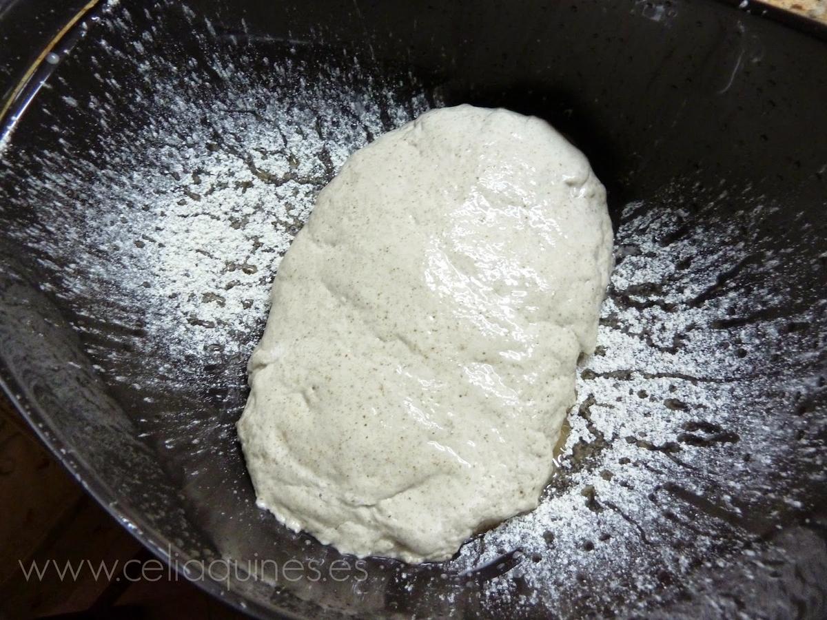 5) Poner la masa en la panera y alisarla con la mano enaceitada. La panera no necesita enharinarse pero puede hacerse para obtener un acabado más rústico.