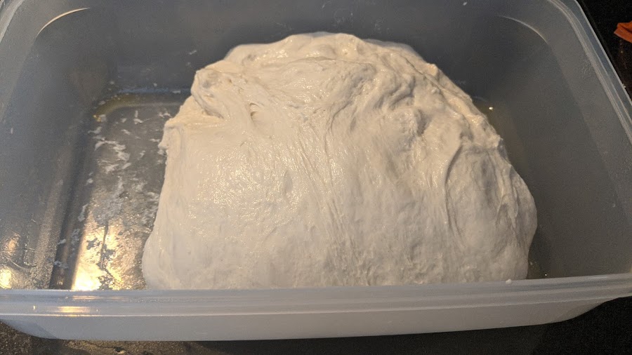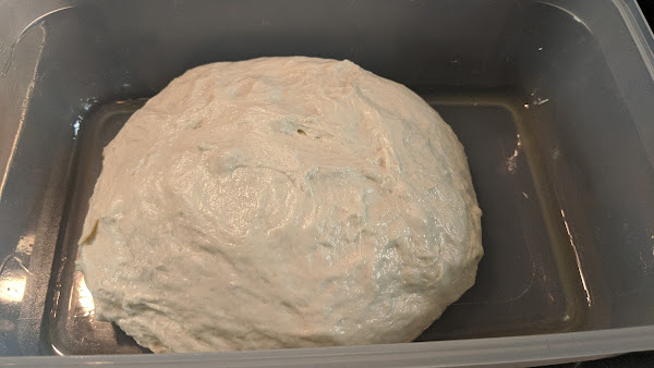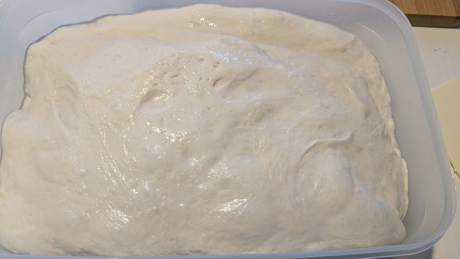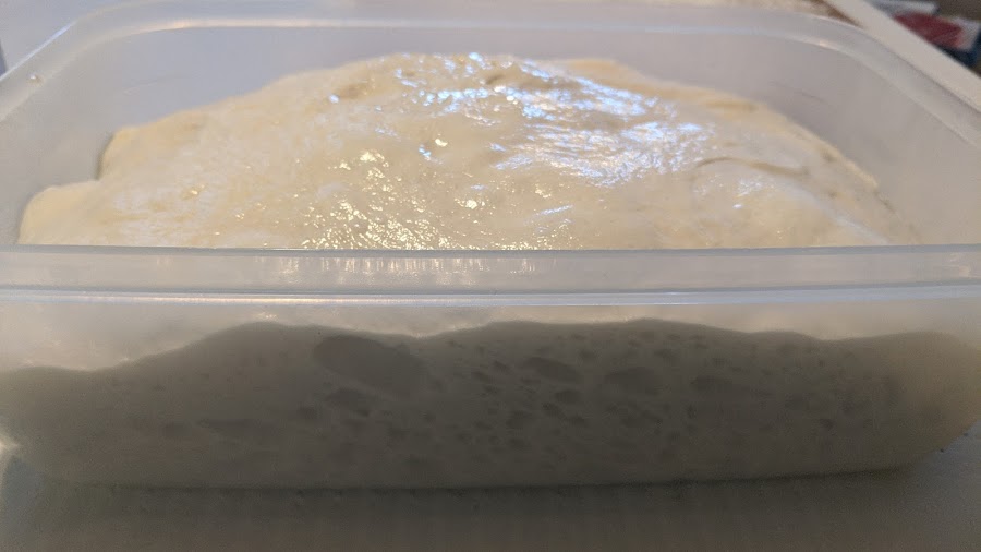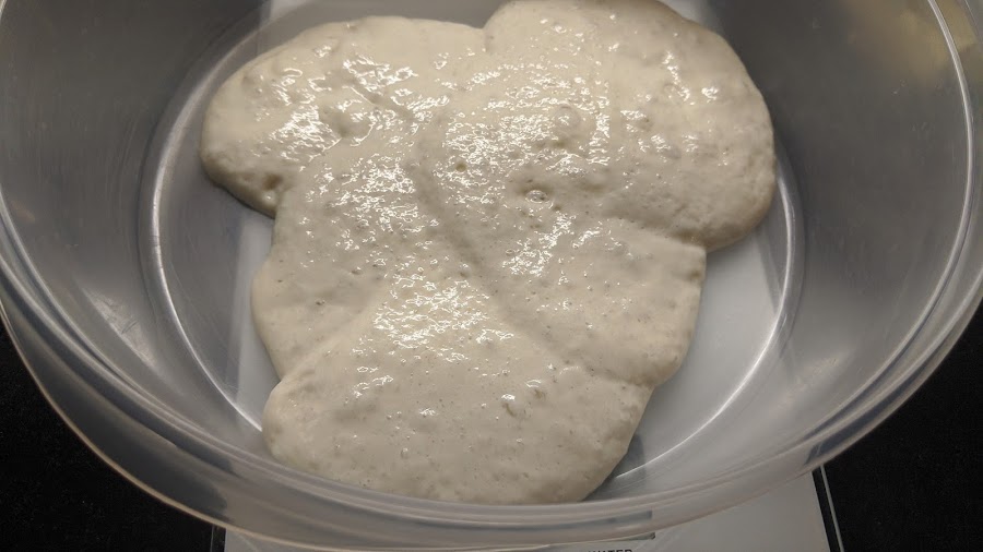 Dejamos un par de horas y volvemos hacer dos pliegues desgasificando. Ya la dejo sin volver a tocar hasta que leva completamente y se llena de burbujas