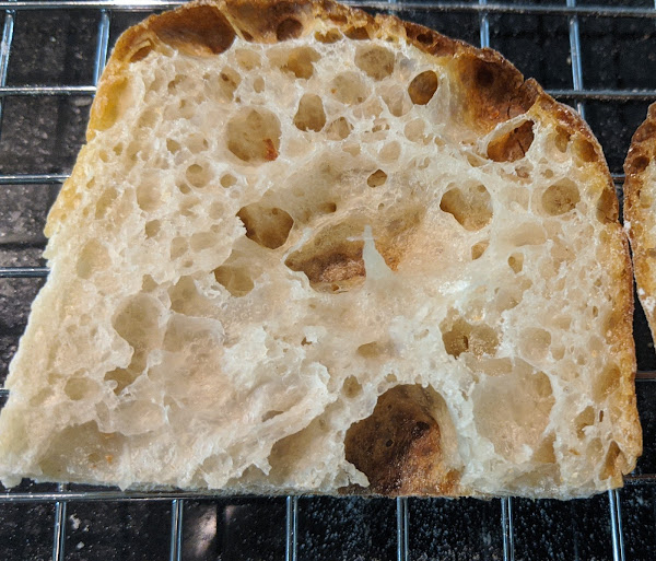 Esta harina no necesita mucha agua y a mí no me gustan las migas con exceso de agua. Además cuánta mayor cantidad de agua más riesgo corren de sobrefermentar. Cómo podréis comprobar, la consigna "a más hidratación mayor tamaño de alvéolos" no es cierta. El resto de parámetros, harina empleada, fórmula ajustada, pliegues, no maltratar la masa y manipularla lo mínimo, la sal desde el principio que refuerza el gluten... Todo es un conjunto necesario para conseguir estas migas.