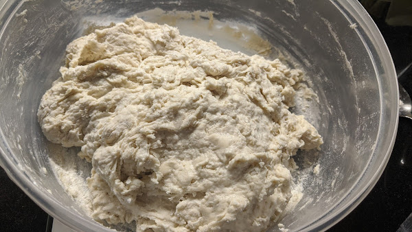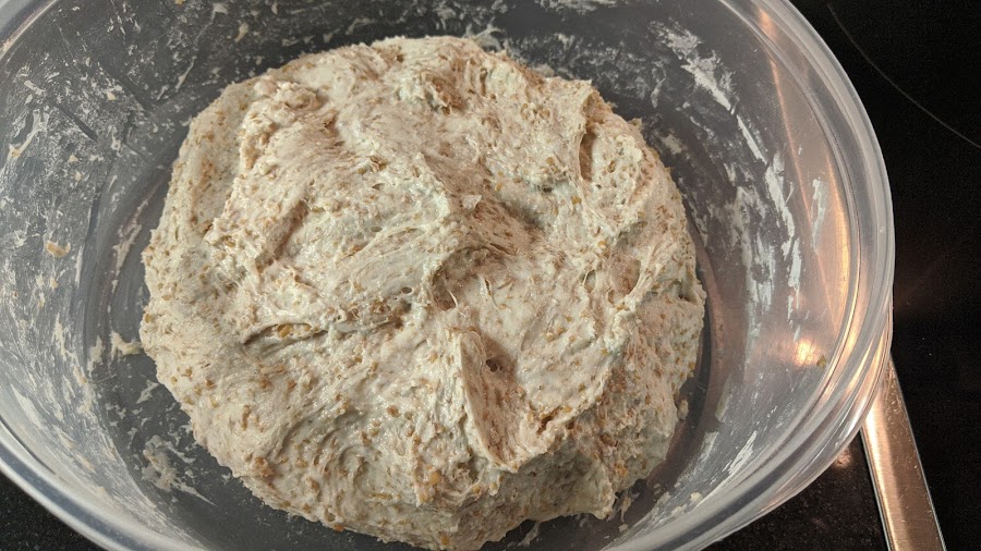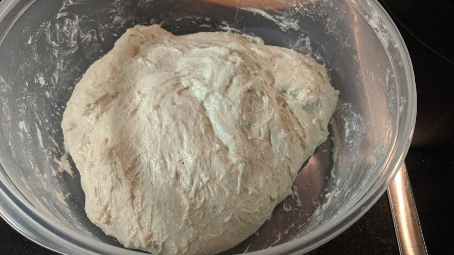 Mezclamos haciendo pliegues con la rasqueta, para ir recogiendo toda la masa, durante 10 segundos. Dejamos reposar una hora y volvemos a plegar. La tercera vez hago 3 pliegues ya a mano (la masa está ya lisa y elástica)