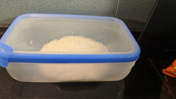 Ponemos los ingredientes en un táper y mezclamos con una cuchara. Dejamos reposar (fermentolisis) durante 30 minutos