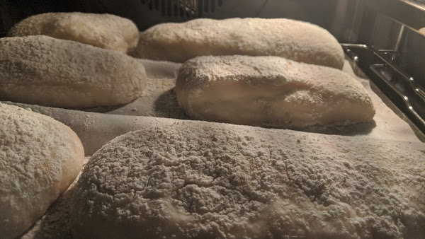 Meto las chapatas con calor solo en solera y bajo la temperatura a 220 grados. Echo sobre las piedras medio vasito de agua, muy poca pero algo pues no son panes muy hidratados. Así están solo 5 minutos. Cambio el horno poniendo calor arriba y abajo otros 5 minutos y manteniendo los 220 grados