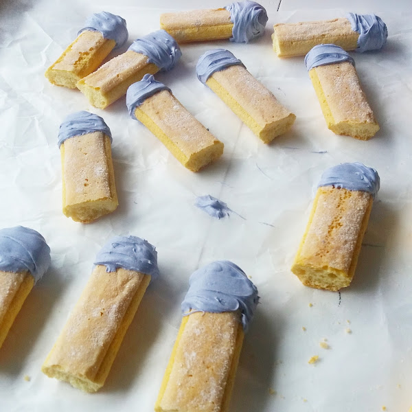 También tenía bizcochos de soletilla de las navidades ( así me ahorré hacerlos ) , y chocolate blanco abierto de varios paquetes. Un poco de colorante lila y un lazo para la foto y listos para empezar.