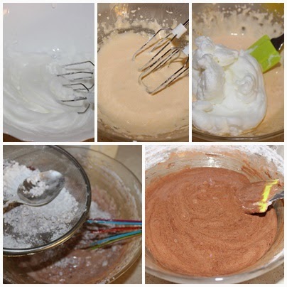 Batimos las yemas con el azúcar hasta que blanqueen. Les añadimos las claras montadas a punto de nieve. Vamos añadiendo la harina tamizada con el cacao poco a poco y con movimientos envolventes.