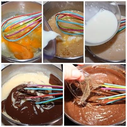 El resto de la leche la añadimos a los huevos y a continuación añadimos la Maizena diluida en la leche. Mezclamos bien y lo llevamos al fuego hasta que espese dándole vueltas constantemente para que no se pegue. Añadimos las gelatina y mezclamos bien hasta que se integre. La dejamos templar.