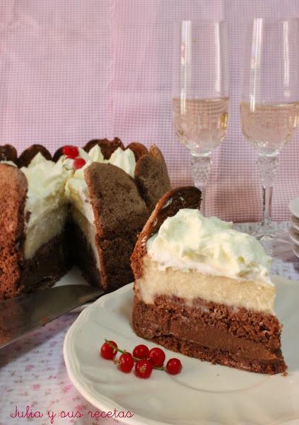Yo la he hecho con bizcochos de soletilla de chocolate y aptos para celiacos, pero para los que no sois intolerantes solo tenéis que sustituir la harina sin gluten por una normal. Y el relleno son dos cremas diferentes una de chocolate y otra de coco.