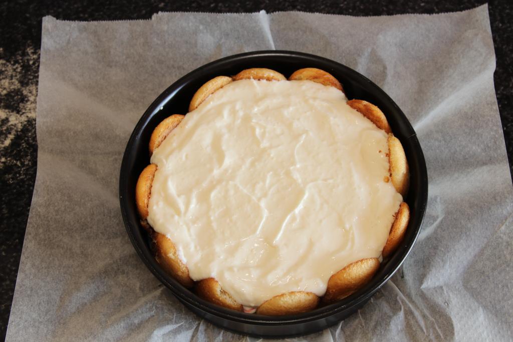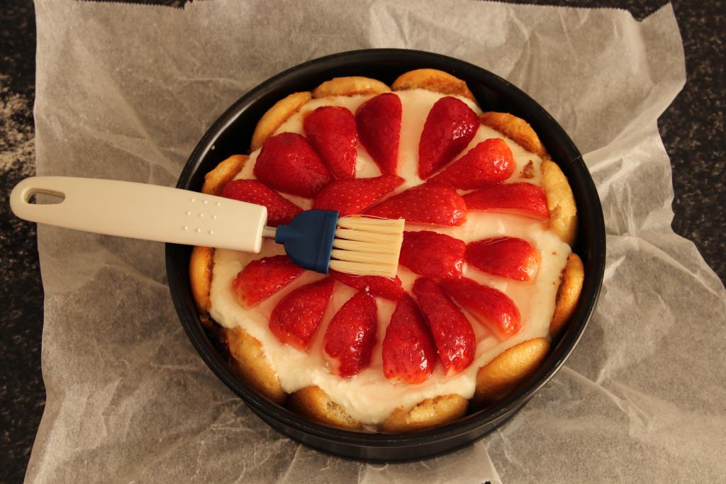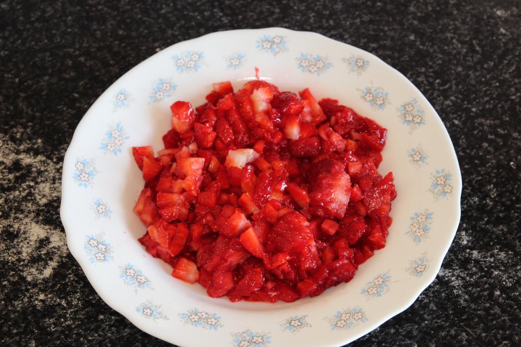 Disponemos una 1/3 parte de la crema sobre los bizcochos de soletilla del molde, cubrimos con una capa de fresas picaditas, ponemos otra capa de crema, otra de fresas… En total son dos capas de fresa y tres de crema (contando la de la cobertura).