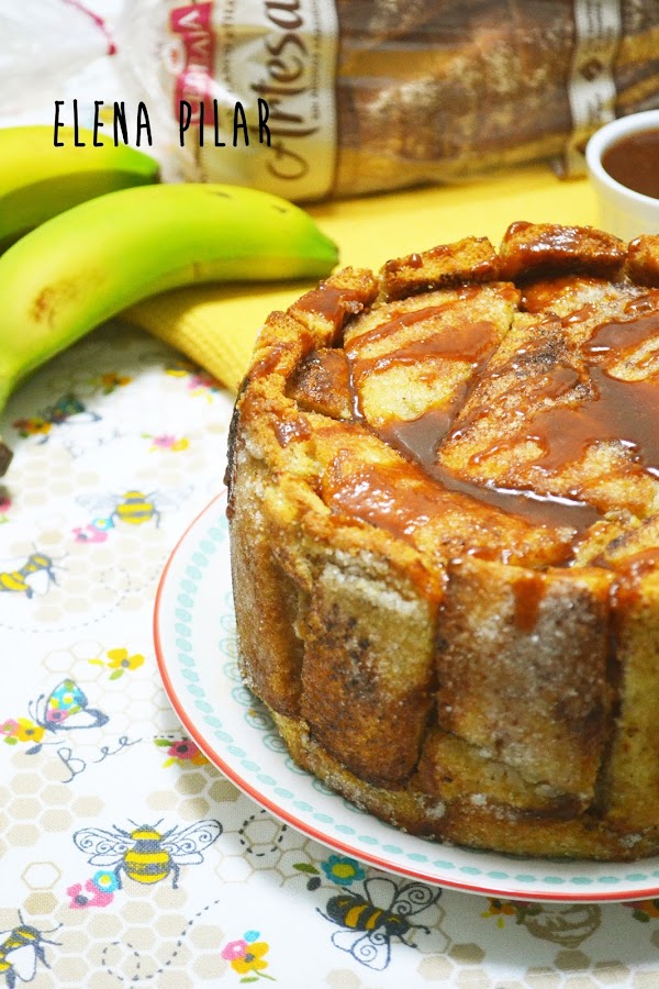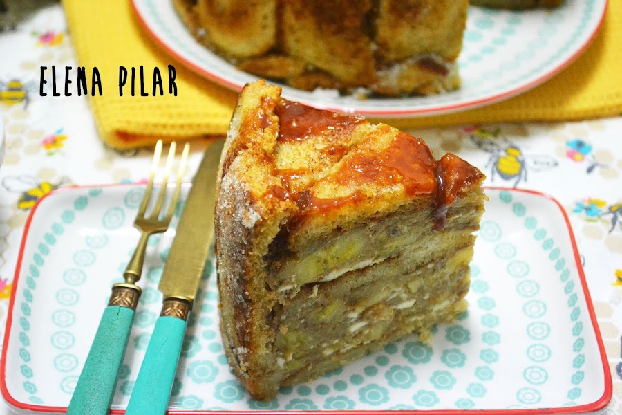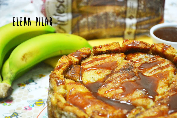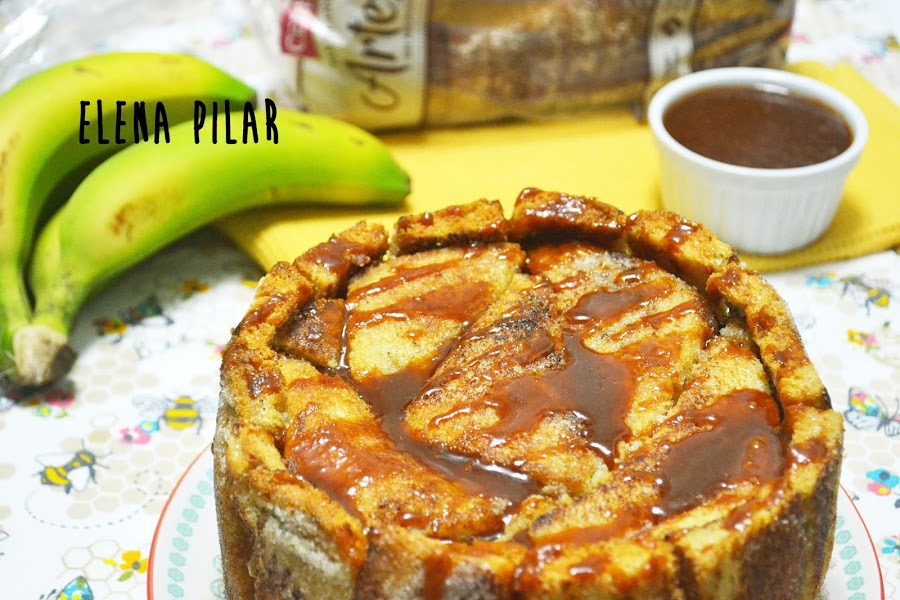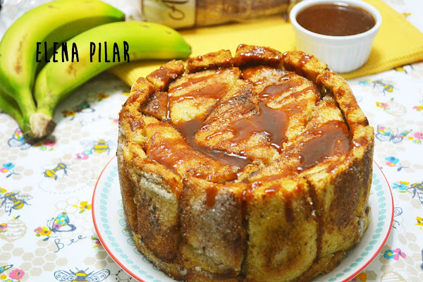 Pero gracias a la receta que he hecho para participar en el concurso de recetas con Panrico y Cerealia, que organiza Canal Cocina, he roto la barrera que me impedía hacer una tarta de ese tipo. ¡¡¡Al fin me he atrevido a elaborar una charlota!!! Aunque no ha sido la charlota propiamente dicha, aquella que se nos vendría a la mente nada más leer o pronunciar su nombre, el método de elaboración, en esencia, es el mismo. En este caso, en lugar de usar bizcochos de soletilla, he empleado pan de molde -que previamente he dorado en una sartén con un poquito de mantequilla y he endulzado con azúcar- y lo he rellenado con una mezcla de plátano caramelizado y queso fresco. Por último, la he acompañado de una salsa que, en mi opinión, es la que mejor encaja con el dulzor del plátano: una salsa de caramelo salado (por cierto, la preferida de mi madre, de hecho, fue ella quien me insistió en rematar este dulce con ella).