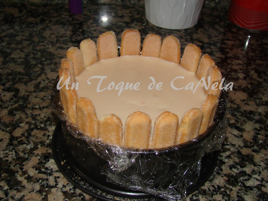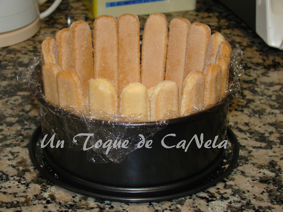 Cortar los extremos de los bizcochos, cubrir el fondo del molde y tapar los huecos con los trozos recortados.