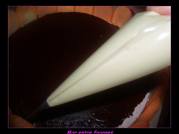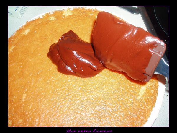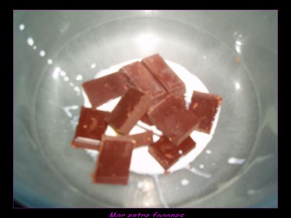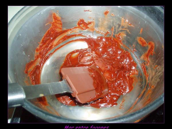 Con la nata (crema de leche) mezclada con la mermelada tapamos el huevo que queda entre los bizcochos y el chocolate.