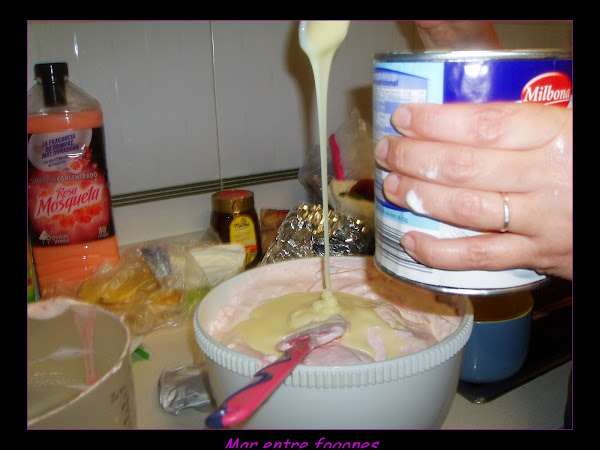 Echamos a la mezcla de la nata (crema de leche) y pasamos las varillas otra vez.