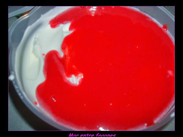 Montamos la nata (crema de leche) y le añadimos una cucharada de mermelada.