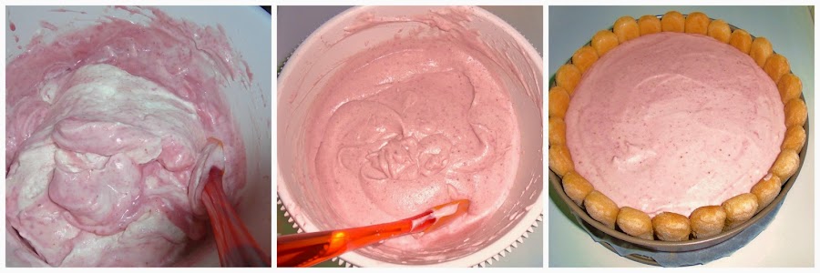 Incorporamos la mousse de fresas a la base de bizcocho que habíamos dejado en la nevera, introduciéndolo nuevamente en ella, para que coja firmeza durante unas cuatro horas o toda la noche.