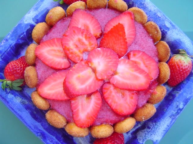 Cortamos las fresas en lonchas y decoramos la Charlotte.