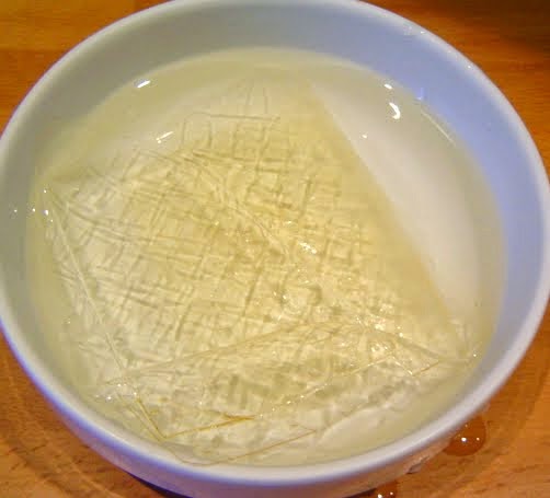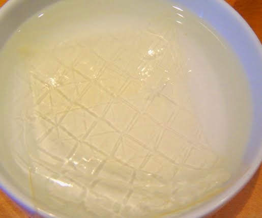 Ahora, ablandamos las hojas de gelatina en agua fría, escurrimos
