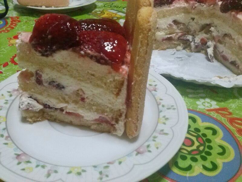 Cortamos el bizcocho en tres discos.Colocamos el primer disco y calamos con el almíbar ligero colocamos las fresa troceada y cubrimos con la nata montada (crema de leche).Repetimos la operación.Terminamos con el bizcocho y cubrimos con una buena capa de nata (crema de leche),alisamos la superficie superior y los laterales.Reservamos un poco en la nevera para que se mantenga firme.