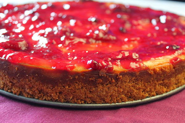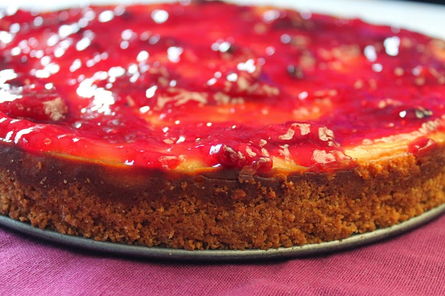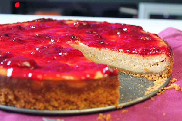 Se trata de una receta tradicional de la repostería americana, y debo decir que es así, porque no es la "tarta de queso" ligerita que he hecho otras veces con recetas más del terreno. Total, que después de horno y frío (horas y horas, ojo!) el resultado es una textura compacta, que contrasta con el crujiente/arenoso de la base de galleta, y la frescura de la mermelada de la cobertura.