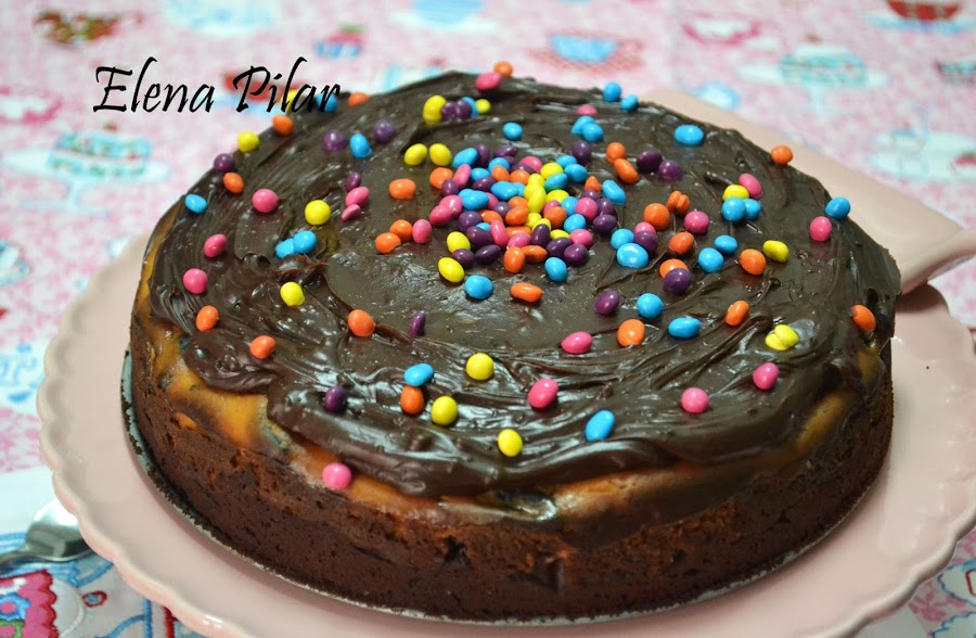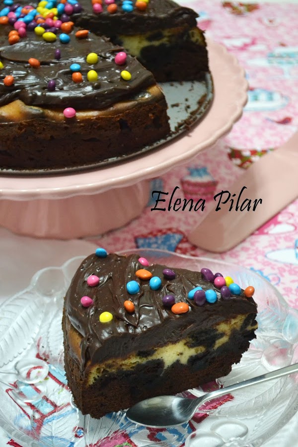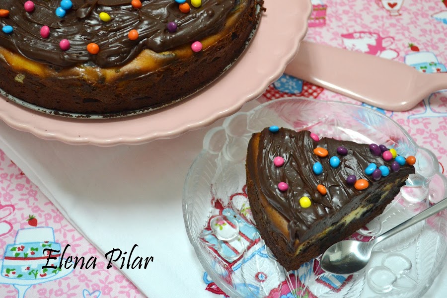 Untamos un molde de 20cm de diámetro con un poco de mantequilla. Vertemos primero la masa de brownie, alisamos la superficie, y vertemos con cuidado la mezcla de queso.