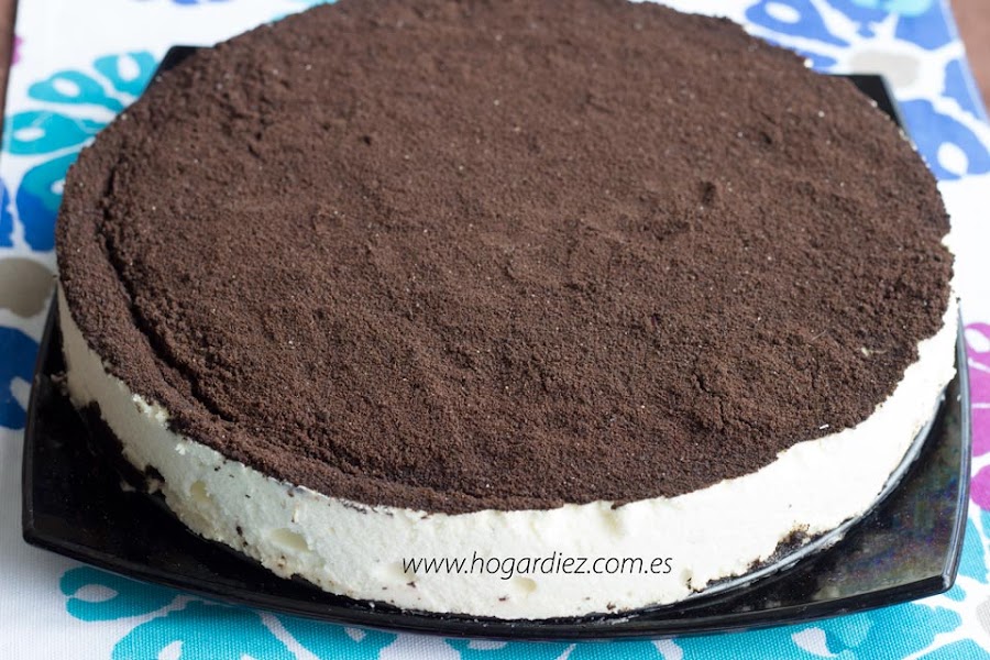 Una vez desmoldada la tarta, decoramos con el resto de galleta que habíamos reservado y lista para comer.