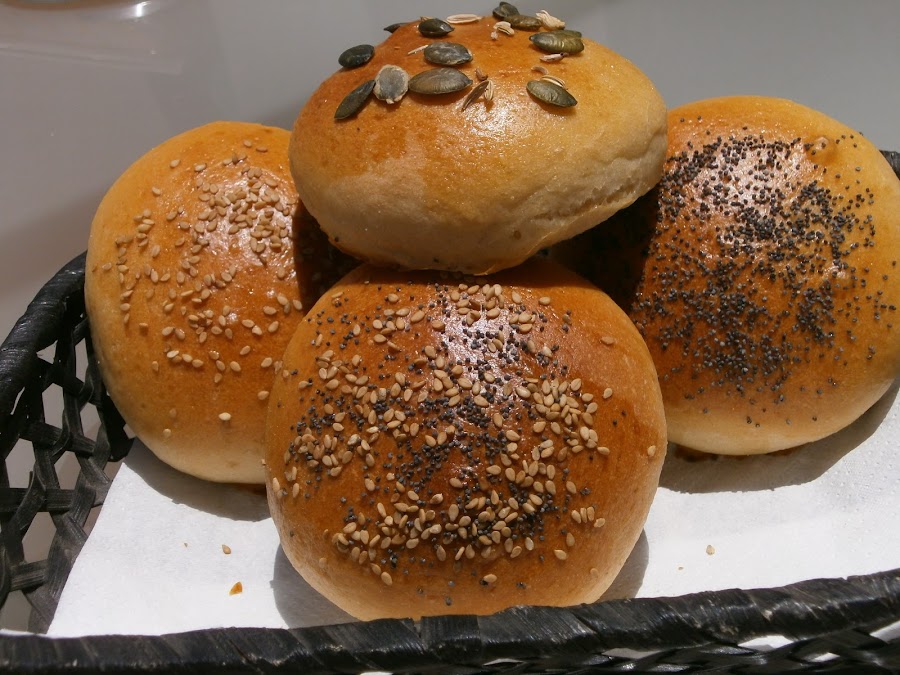 Retirar el papel plástico y pincelar la parte superior de los buns con la mezcla de huevo y leche. Espolvorear con las semillas y cuando el horno alcanza la temperatura hornear hasta que estén doradas (en mi horno de 20 minutos). El pan debe ser bien dorado por encima y más claro en la parte inferior.