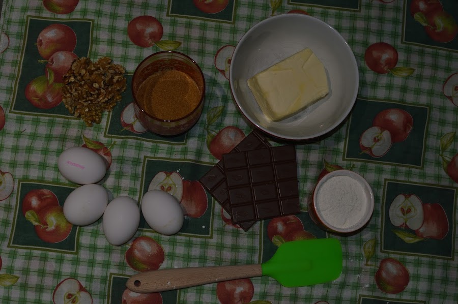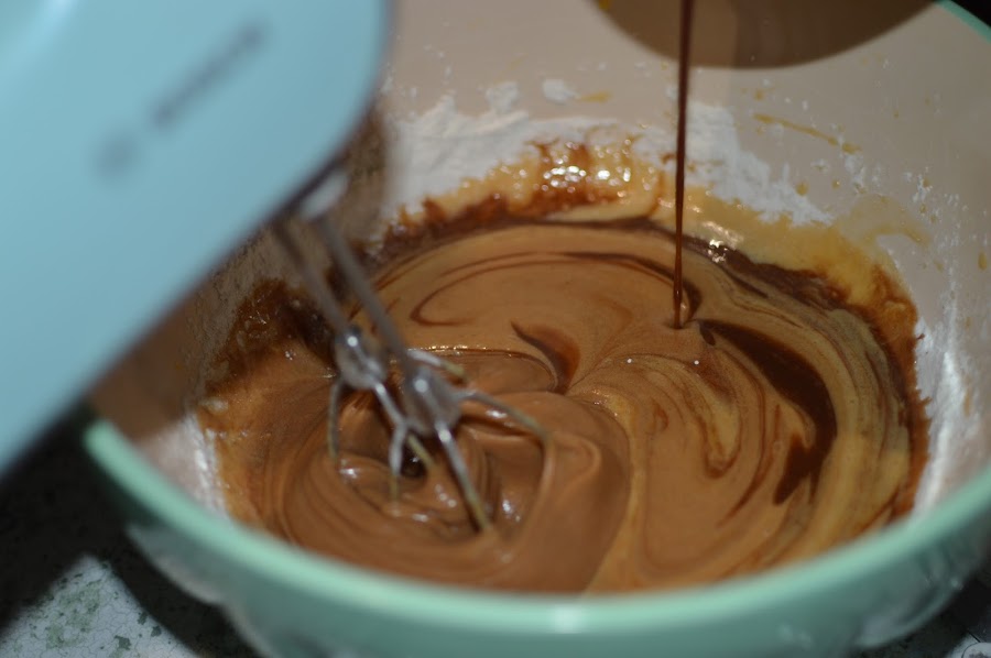Mezclamos los huevos, el azúcar moreno, y la harina, y por último echamos la mezcla de chocolate y mantequilla poco a poco mientras lo seguimos batiendo.