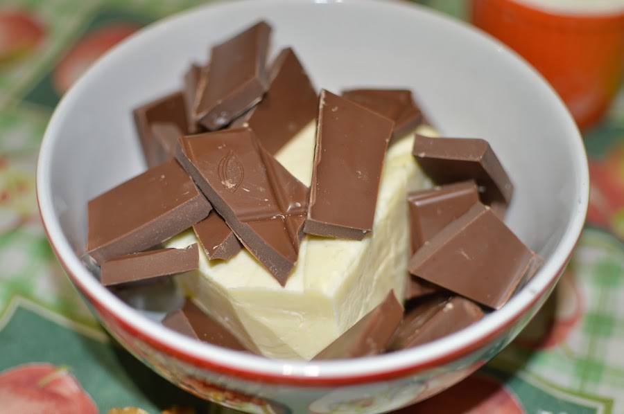 Mezclamos el chocolate con la mantequilla y derretimos en el microondas en intervalos cortos para evitar que se queme el chocolate