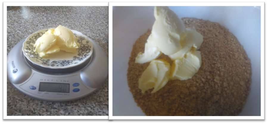 Lo primero que hay que hacer es triturar las galletas, que posteriormente se mezclarán con la mantequilla que previamente habríamos sacado del frigorífico para que no estuviera demasiado dura a la hora de usarla. Mezclamos muy bien galletas y mantequilla y con ello forramos un molde desmoldable, cuidando de cubrir bien la base y los laterales. El molde que usé tenia 24 cm y la verdad me fue perfecto para estas cantidades, quedando la tarta "altita" que era justo lo que quería.