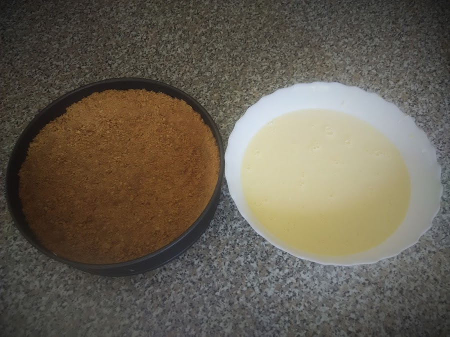 Con lo primero que debe comenzarse es haciendo la base de galletas, pues será sobre la cual se vierta el relleno de la tarta. Como comprobaréis en los ingredientes, no se usaron las típicas galletas maría, ni las digestive, sino las tostadas tipo chiquilín. Quise probar con estas porque pensé que el toque crujiente que no tienen las María ni las Digestive, haría que quedase una textura y sabor diferentes y tal vez mejores al que normalmente tienen las bases de galletas.