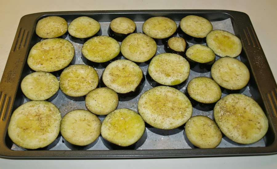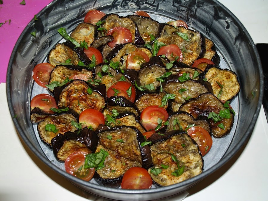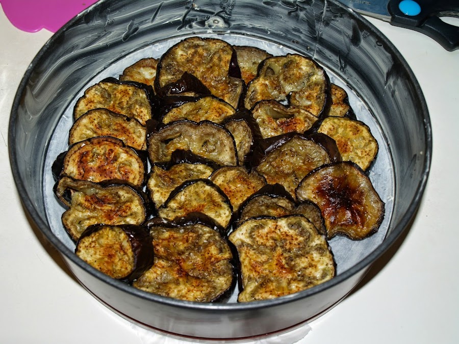 - Colocamos la berenjena en un molde engrasado o forrado de papel vegetal (circular o cuadrado), superponiendo unas rodajas sobre otras, en línea, como en la foto.