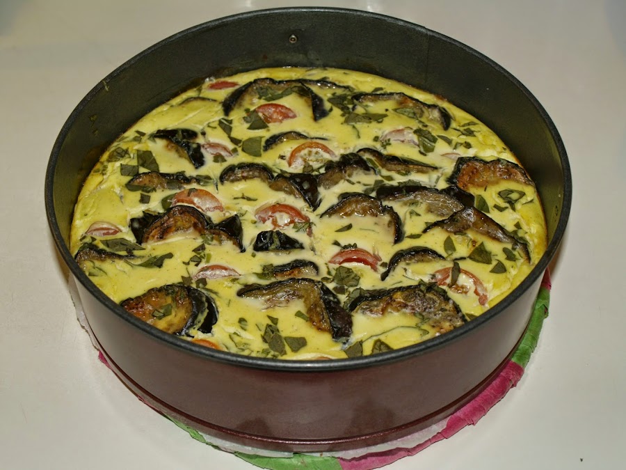 - Vertemos la mezcla de queso en el molde, sin que llegue a cubrir la verdura por completo, que sobresalgan una parte de las berenjenas y los tomates. Espolvoreamos el orégano restante y horneamos unos 30 - 40 minutos, hasta que la masa esté cuajada. Pichamos en el centro con un palillo para comprobarlo. Cuando salga limpio estará lista.