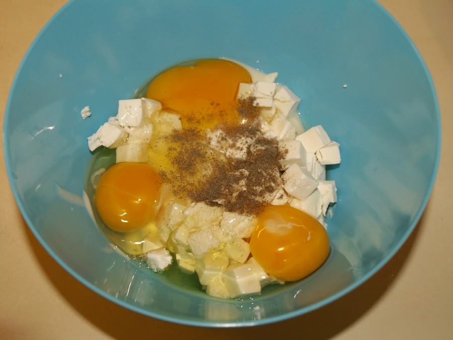 - En un bol ponemos los huevos, la crema de leche, el feta y el queso crema, y batimos hasta obtener una mezcla homogénea, sin grumos, y densa (lo podemos pasar por la batidora). Salpimentamos al gusto y volvemos a mezclar.