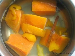 Primero ponemos la calabaza en un recipiente que pueda ir al fuego, cubrimos con agua, adicionamos la canela, los clavos y la piel de naranja, llevamos a fuego medio y retiramos de este cuando al meter un cuchillo, la calabaza este hecha. Colamos la calabaza, quitamos los clavos y la canela, escurrimos muy bien para quitar lo máximo el agua y le pasamos triturado de alimentos para hacer un puré. Reservamos.