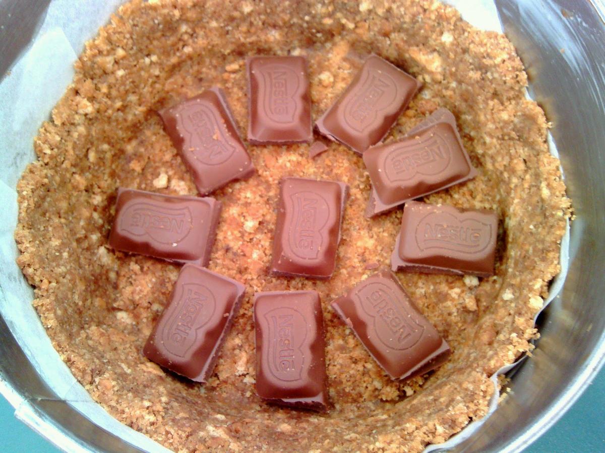 Aparte, trituramos las galletas maría muy bien, agregamos la canela, revolvemos y adicionamos la mantequilla que estará a temp. ambiente, mezclamos hasta incorporar y con esta cubrimos la base del molde de manera uniforme y con lo que nos sobra, cubrimos los laterales del mismo, presionando bien para que se fije al molde. Encima cubrimos la base con el chocolate en cuadritos cubriendo toda la superficie, reservamos.