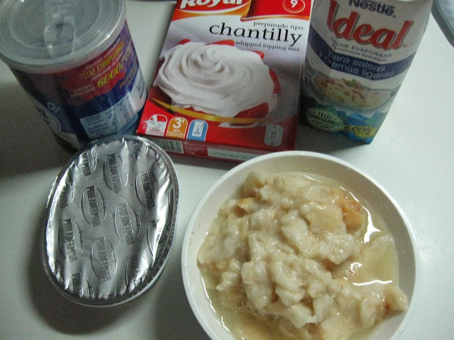 6 hojas de gelatinaLe puse ese preparado porque no tenía nata (crema de leche), la batí con 1/2 taza de leche evaporada pura.