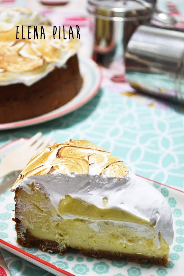 En este caso, a la mezcla de queso, tan solo le añadí un pelín de ralladura de lima. Por encima, una vez horneada y reposada, le extendí mi curd de lima y, sobre éste, un generoso copete de merengue italiano requemado.