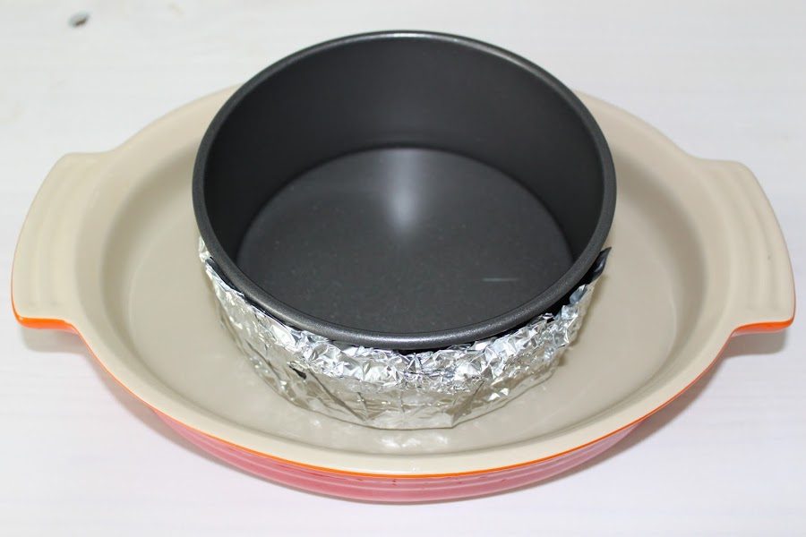 1. Precalentamos el horno a 200º. Forramos nuestro molde (si es desmontable) con papel de aluminio para evitar que pueda filtrarse agua durante el horneado que será al baño maría