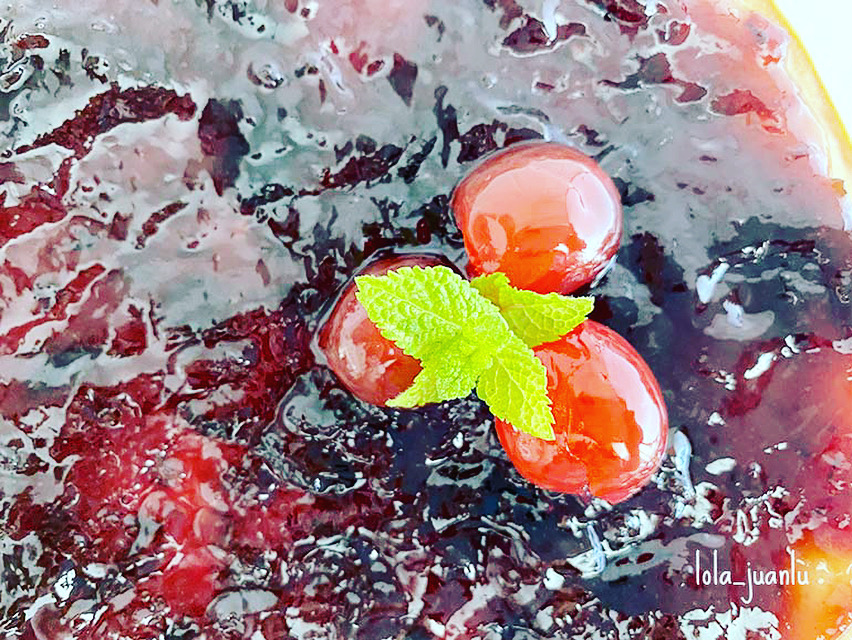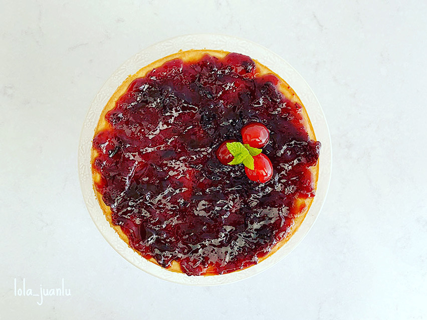 Sacamos la tarta de la nevera y la cubrimos con mermelada de cerezas. Desmoldamos el pastel y lo colocamos en una base de tarta. Y ahora solo nos queda decorarlo con unas cerezas en almíbar y unas hojas de menta.