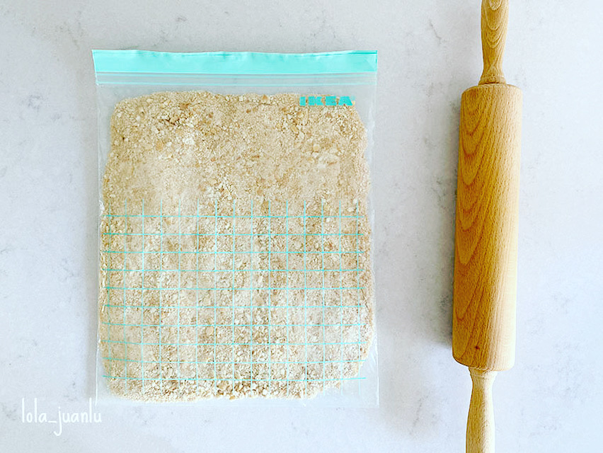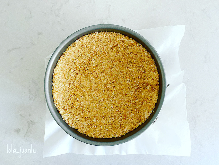 A continuación, preparamos la base de la tarta, para ello, trituramos las galleta y reservamos. Introducimos la mantequilla en un cazo que ponemos al fuego y cuando esté derretida, la mezclamos con las galletas trituradas. Vertemos la mezcla en el molde y cubrimos con ella la base y un poco de las paredes, ayudándonos con una cuchara o las manos.