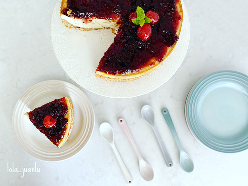 ¿Qué te parece esta tarta de queso y chocolate blanco con confitura de cerezas? Es preciosa y está buenísima. Ideal para una celebración.