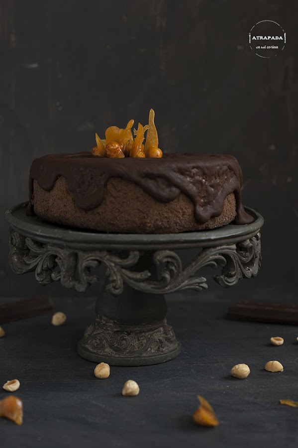 Calentamos en una cazo la nata (crema de leche) y añadimos el chocolate, quitamos del fuego y removemos bien el chocolate hasta que se integre completamente. Sacamos la tarta del frigorífico, vertemos el ganache de chocolate dejando que se resbale por los extremos de la tarta. Coronamos con las avellanas caramelizadas. Metemos un poco en el frigorífico para que el chocolate endurezca un poco y sacamos a la hora de servir.