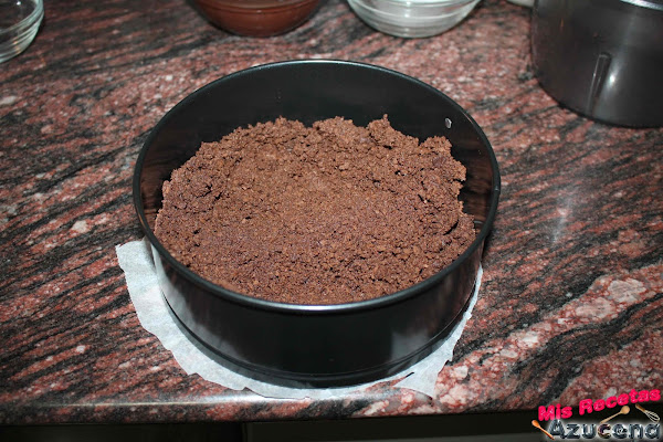 Cogemos el vaso picador y pondremos las galletas la mantequilla y las pepitas de chocolate, lo picamos todo hasta que quede como una arena pegajosa. Ahora lo añadimos al molde, lo repartimos bien, hay que tener en cuenta que debemos cubrir también los lados.