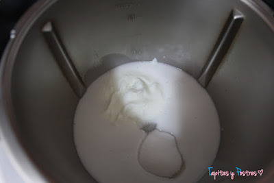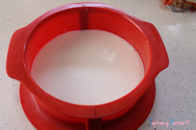 Vamos con el relleno. Ponemos en la thermomix la leche de coco (agitamos antes la lata), el queso fresco batido y el azúcar. Cocinamos 9 minutos a 90º y velocidad 4. Podemos usar otro tipo de queso como el phildelphia, pero el queso fresco batido tiene mucha menos grasa y es más ligero. Tres minutos antes de acabar la cocción agregamos los dos sobres de cuajada por el bocal y dejamos que acabe la cocción. Sin thermomix se puede hacer todo en una cazuela amplia, mezclando y calentando a fuego suave sin dejar de remover hasta que notemos que ha espesado.